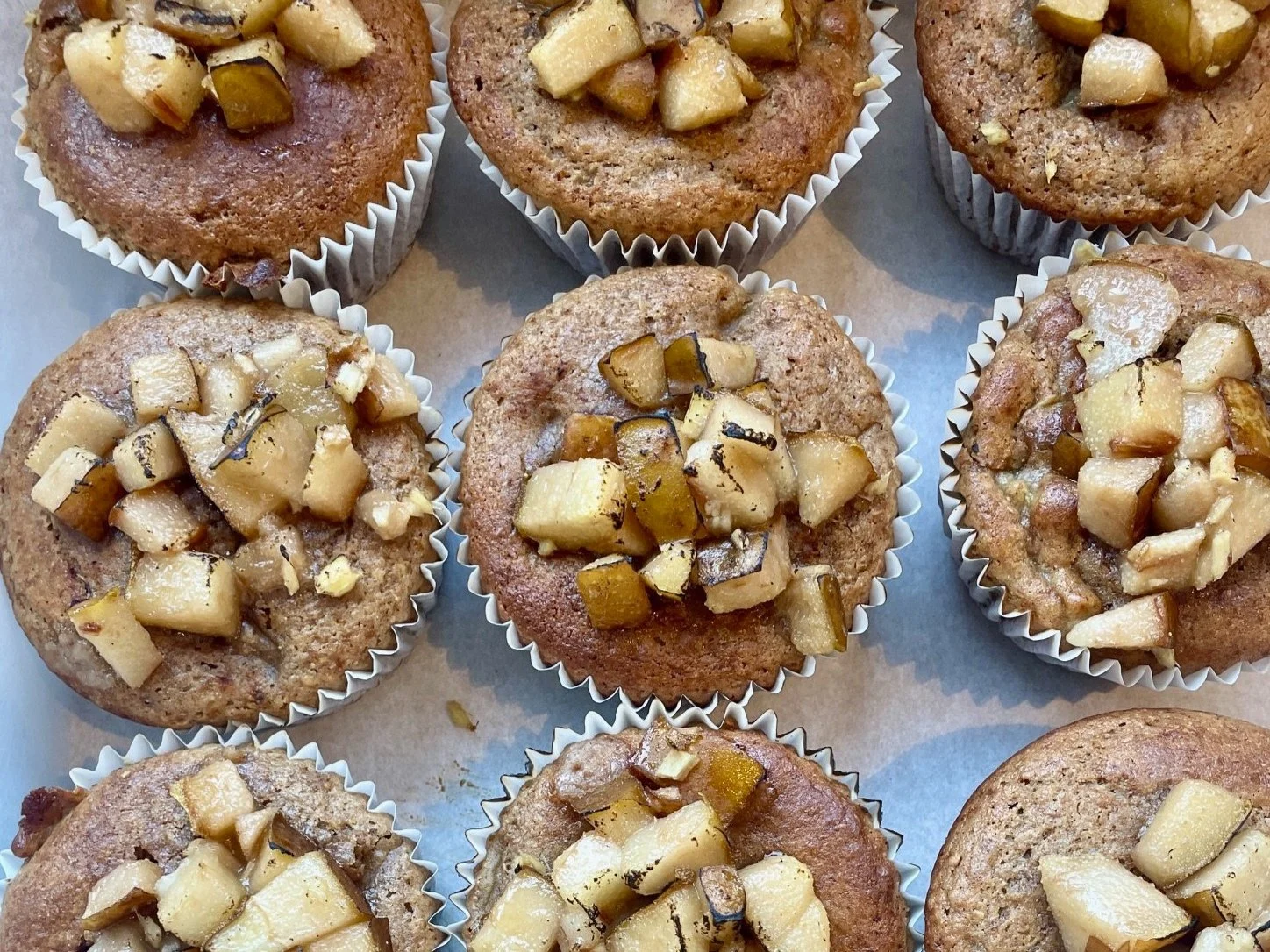 Place the tray in your oven and bake for 20-25 minutes until golden and dry on the surface - timings will depending on the size you’ve made so test with a skewer for doneness- it should come out clean. While your muffins are baking, gently heat the remaining pear mix in the pan until bubbling. Let the muffins and the fruit cool slightly then scoop a generous portion of fruit onto each muffin.